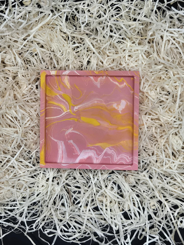 Plateau carré en jesmonite rose marbré jaune et blanc